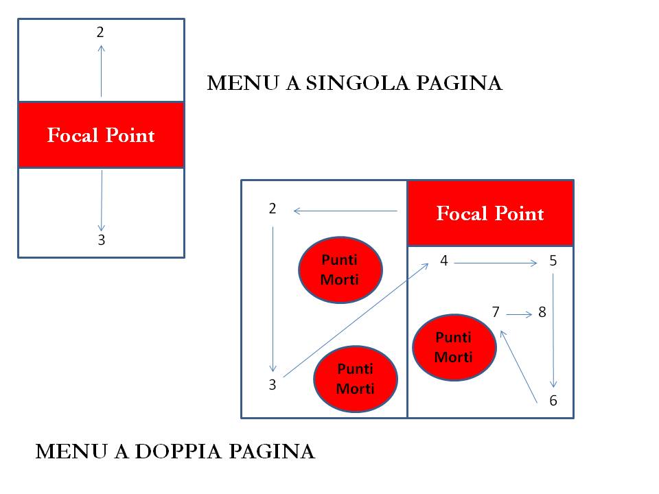Nel caso tu avessi un menu a doppio pannello il Focal Point è in alto a destra sulla seconda pagina, dove inserirai prodotti a maggiore marginalità. Poi seguirai il punto due in alto a sinistra sulla prima pagina e così via fino al punto numero 8 come indicato in figura. Da far attenzione che negli spazi vuoti, chiamati punti morti, andranno inseriti i prodotti a minore marginalità. Inoltra colloca immagini irresistibili di questi piatti nel menù.