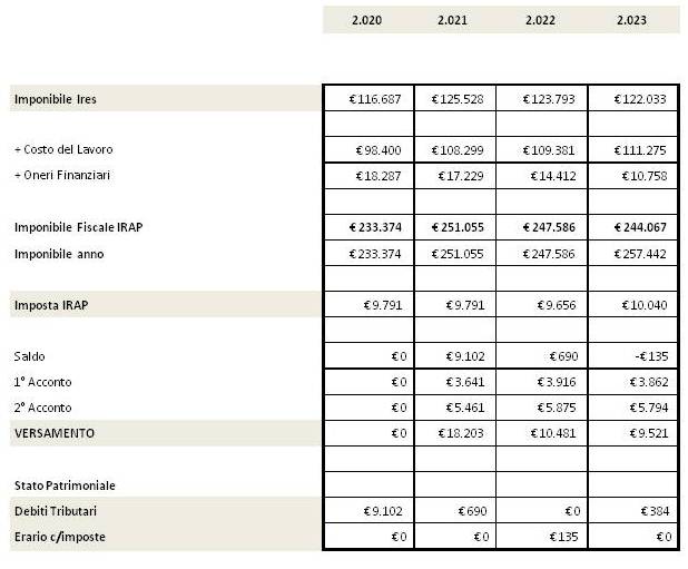 Anche qui come per l’imposta Ires, si evidenzia che in quanto l’azienda è una start Up, le imposte di competenza del primo anno saranno liquidate nel 2° anno (voce saldo).