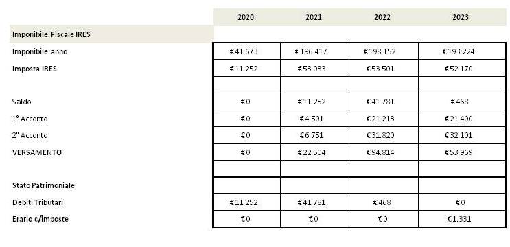 Si evidenzia che in quanto l’azienda è una start Up, le imposte di competenza del primo anno saranno liquidate nel 2° anno (voce saldo).