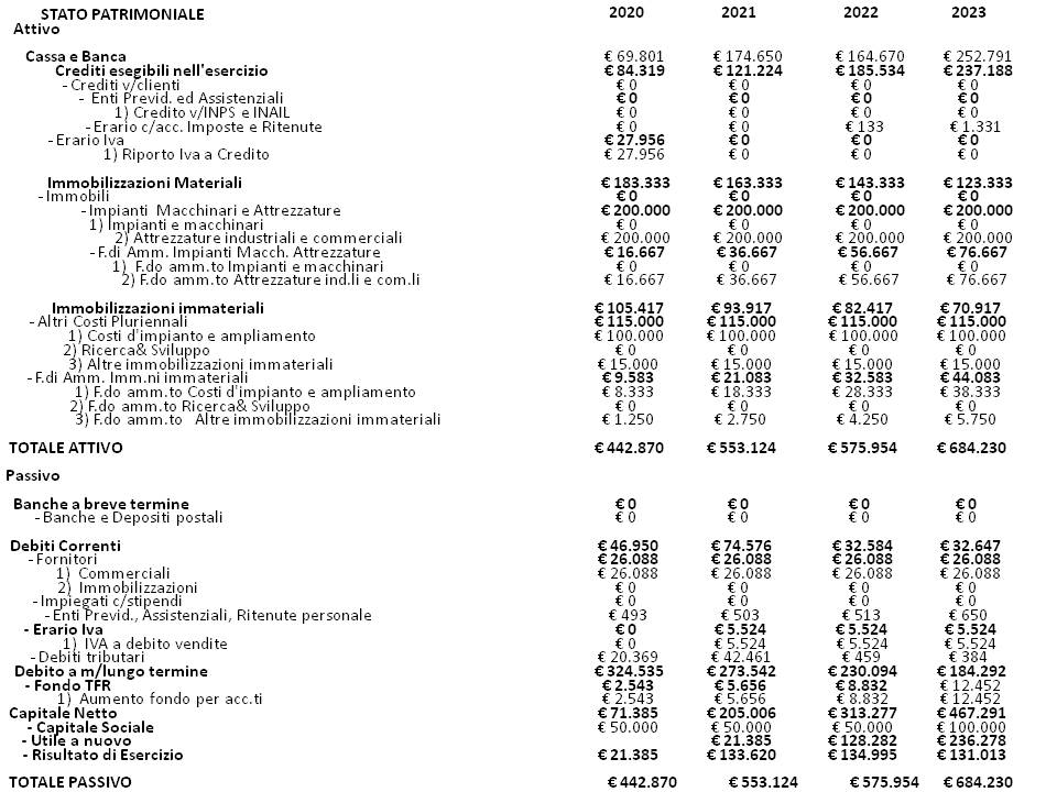 Dal nostro modello riportiamo l’esempio di Stato Patrimoniale per la start simulata, e nei dettagli lo Stato Patrimoniale mensile.
