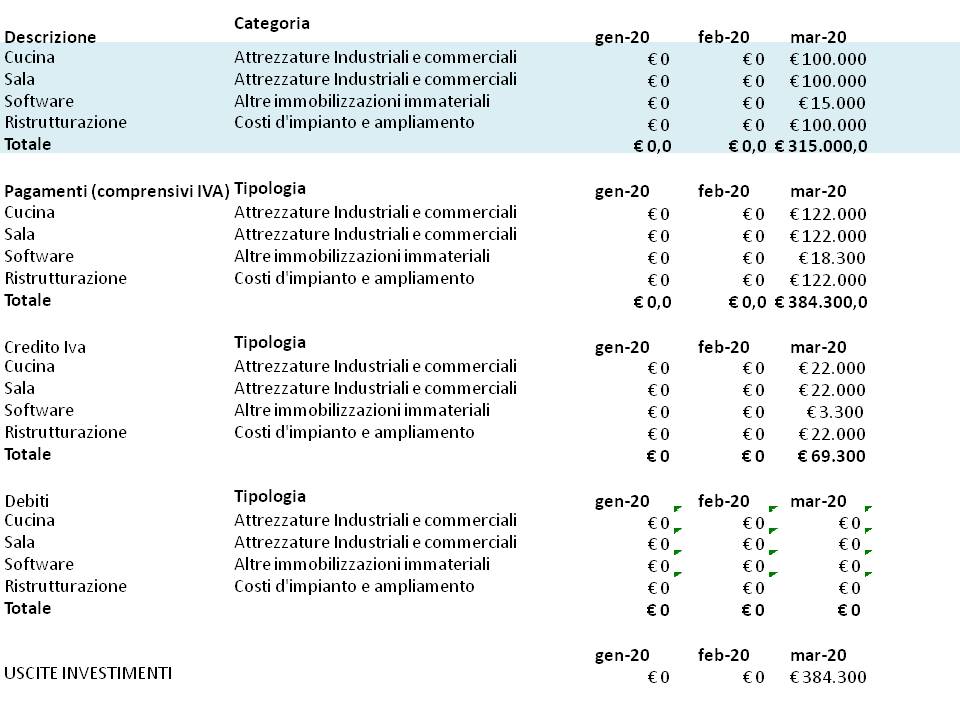 Nella Tabella sono riportati gli Investimenti inseriti nel nostro Modello Excel, è molto importante la pianificazione mensile degli investimenti e le modalità di pagamento in quanto impattano sul fabbisogno finanziario di cui necessità l’impresa. Per questo motivo è importante riportare il riepilogo mensile nella tabella .