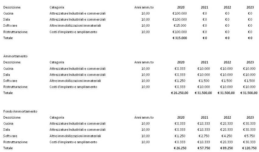 Sono riportati, il costo di acquisto (patrimoniale) i pagamenti (finanziario) , il credito iva e i debiti che si generano nei confronti dei fornitori (patrimoniale). Riportiamo poi la tabella con il riepilogo annuale dell’ammortamento (economico) e relativo fondo ammortamento (patrimoniale).