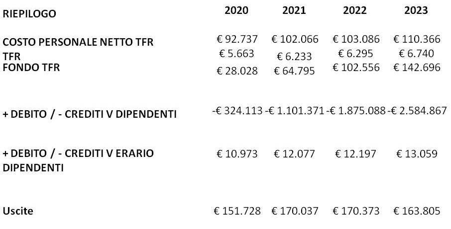 Riportiamo nella tabella, sotto il riepilogo annuale del costo del Personale, delle relative uscite e degli aspetti patrimoniali.